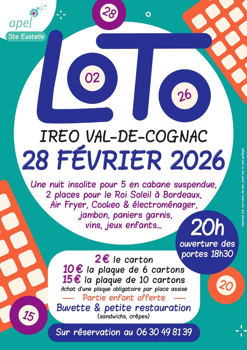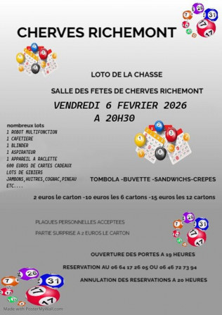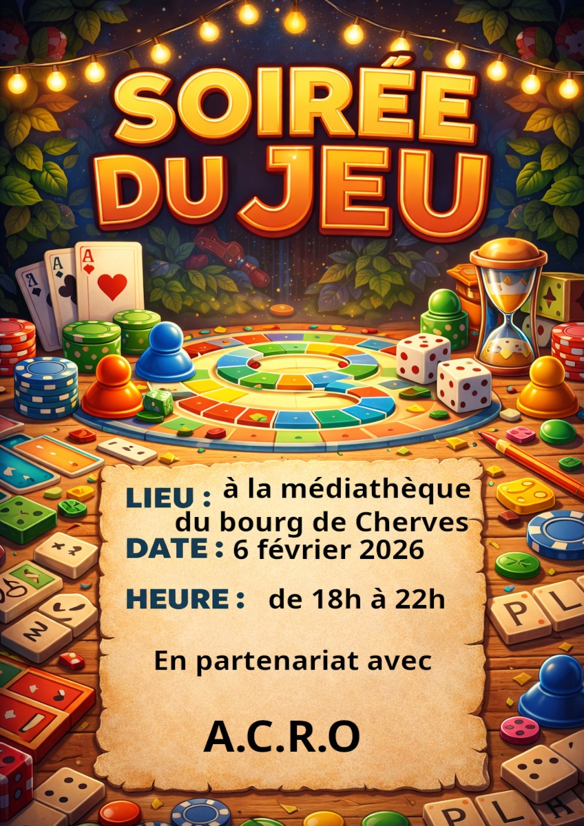 | Médiathèque Municipale : Le 06/02 de 18h à 22h Soirée jeux. Et si on jouait ? à la médiathèque du bourg de Cherves Venez passer un moment pour jouer en famille ou entre amis !!! Gratuit En partenariat avec A.C.R.O Détails Société de Chasse de Cherves-Richemont : Le 06/02 à 20h30 Loto de la chasse Détails APE des écoles publiques du Canton Buhet : Le 07/02 à 19h30 Loto à la salle des fêtes du bourg de St Sulpice Détails Médiathèque Municipale : Du 10/02 au 21/02 Les semaines du jeu à la médiathèque du bourg de Cherves Tous les jours de 10h à 12h Gratuit Détails Médiathèque Municipale : Le 10/02 de 14h à 17h Atelier créatif sur le thème « Carnaval » sur réservations au 05 45 83 70 40 Gratuit à la médiathèque de Cherves-Richemont Détails Divers : Le 15/02 1/2 finale championnats de France de cross dans le cadre du centre équestre de Boussac Détails Médiathèque Municipale : Le 25/02 à 16h30 L’arbre à contes (jusqu'à 5 ans) à la médiathèque du bourg de Cherves « hum... Les crêpes » Gratuit Détails Vivre en Borderies : Le 27/02 à 20h30 Conférence « L'histoire insolite de la vallée de l'Antenne » à la salle des fêtes du bourg de St Sulpice. Entrée 5€ Détails L'Abaca : Le 28/02 à 20h30 One Man Show Tanguy Pastureau « Un monde hostile (pour un cœur tendre) » à L'Abaca Détails APEL de Ste Eustelle : Le 28/02 à 20h30 LOTO à l'Institut de Richemont Sur réservation au 06 30 49 81 39 Détails |