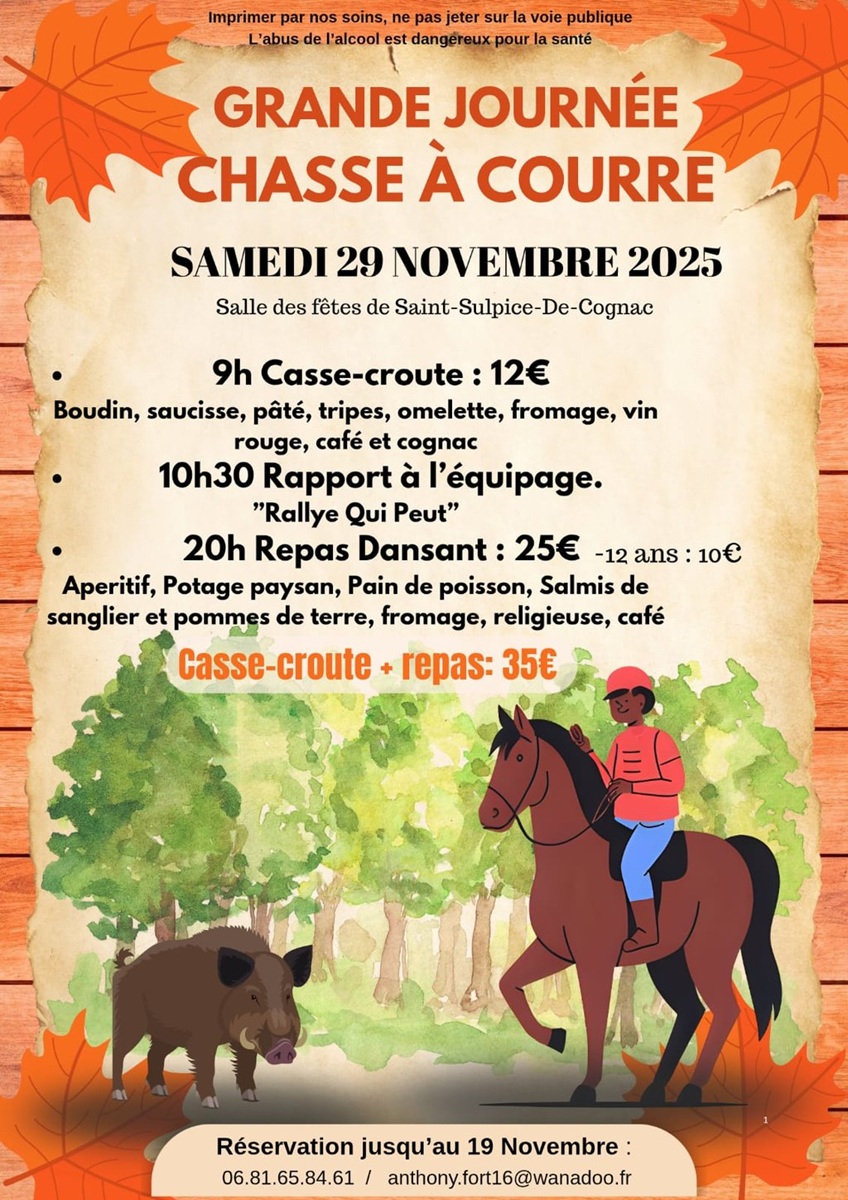 Vivre en Borderies : Le 16/11 Marché des Borderies bourg de St Sulpice de Cognac Spécial 25 ans Détails Société de chasse St Hubert : Le 29/11 Chasse à courre, casse-croûte et repas dansant à la salle des fêtes du bourg de St Sulpice 12€ le casse-croute de 9h30, 25€ le diner dansant (35€ les deux) Détails Médiathèque Municipale : Le 29/11 de 08h à 12h Foire aux livres à la médiathèque du bourg de Cherves Détails Divers : Le 29/11 à 20h30 Choralesong fête ses 20 ans à L'Abaca Détails Médiathèque Municipale : Du 02/12 au 06/12 La foire aux livres se prolonge à la médiathèque du bourg de Cherves (aux horaires d'ouverture de la médiathèque) Détails BTC-Cognac : Le 05/12 Initiation au Ball-Trap. 20€ matériel fourni au ball-trap du bois d'Ouliat dans le cadre des animations au profit du Téléthon Société de Chasse : Le 05/12 à 20h Repas de la chasse 20€ par adulte Animation assurée par Diapason dans le cadre des animations au profit du Téléthon Médiathèque Municipale : Le 06/12 Atelier « Fait Maison » à la médiathèque du bourg de Cherves Atelier cosmétique Municipalité : Le 06/12 à 09h Randonnée pédestre, marche nordique et sortie VTT Départ de L'Abaca. 5€ au profit du Téléthon. dans le cadre des animations au profit du Téléthon Team Ouins Ouins : Le 06/12 de 10h à 12h Course de la solidarité 5 et 10Kms (course ou marche). 5€/participant au profit du Téléthon. départ au stade Francis Paumero à 10h. dans le cadre des animations au profit du Téléthon Pluri-associatif : Le 06/12 à 15h Salon de thé et spectacle à L'Abaca Salon de thé, danses... Entrée 3€